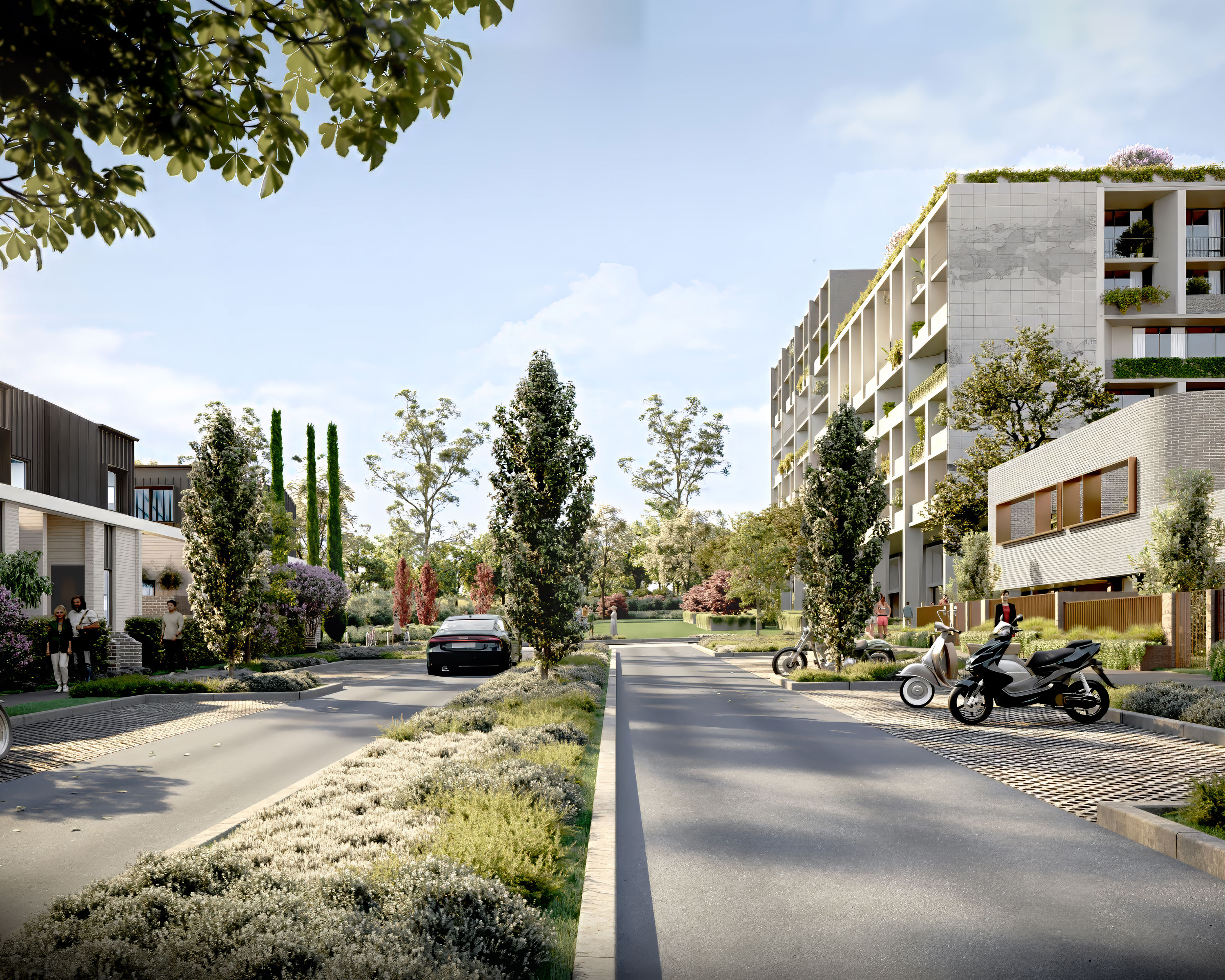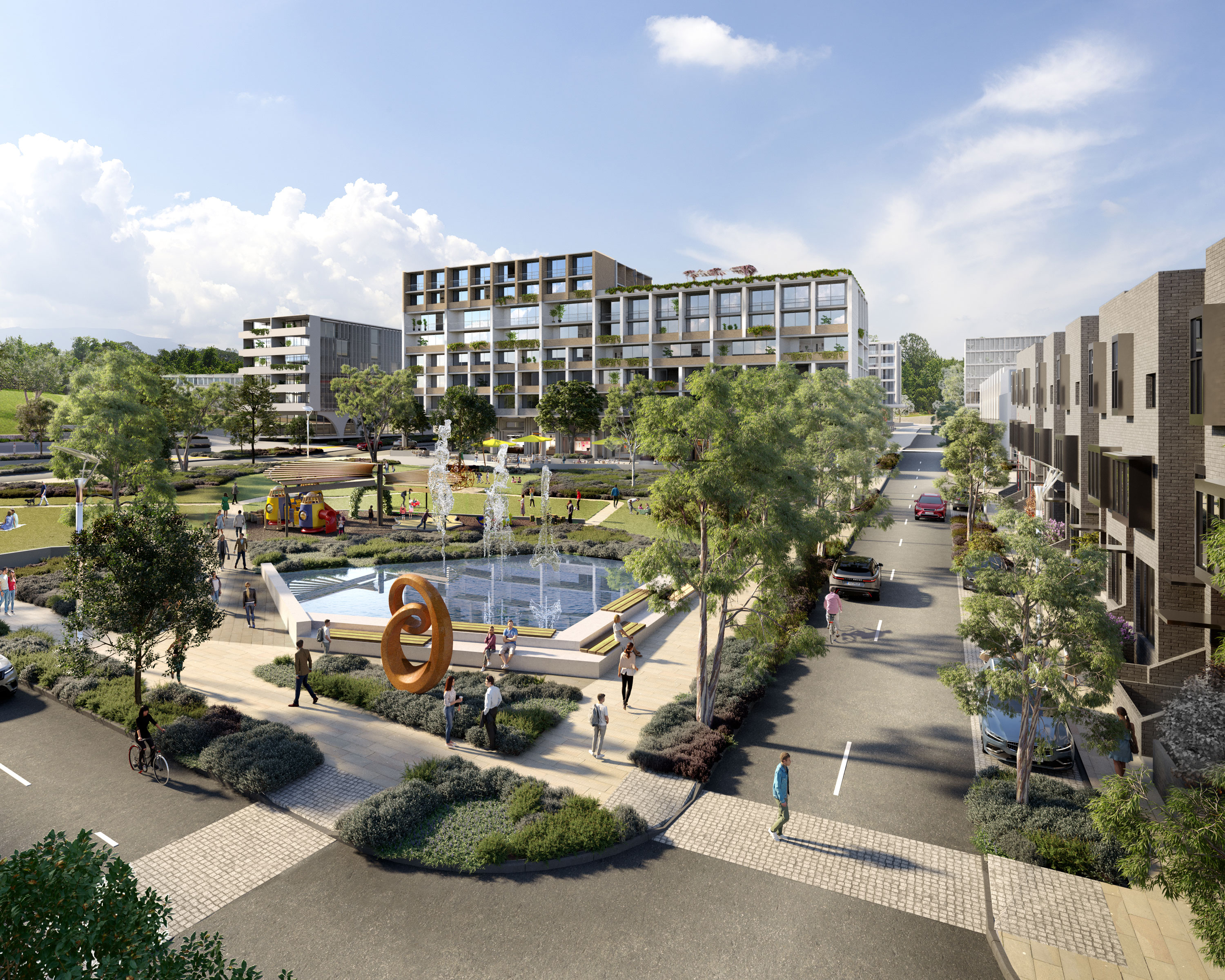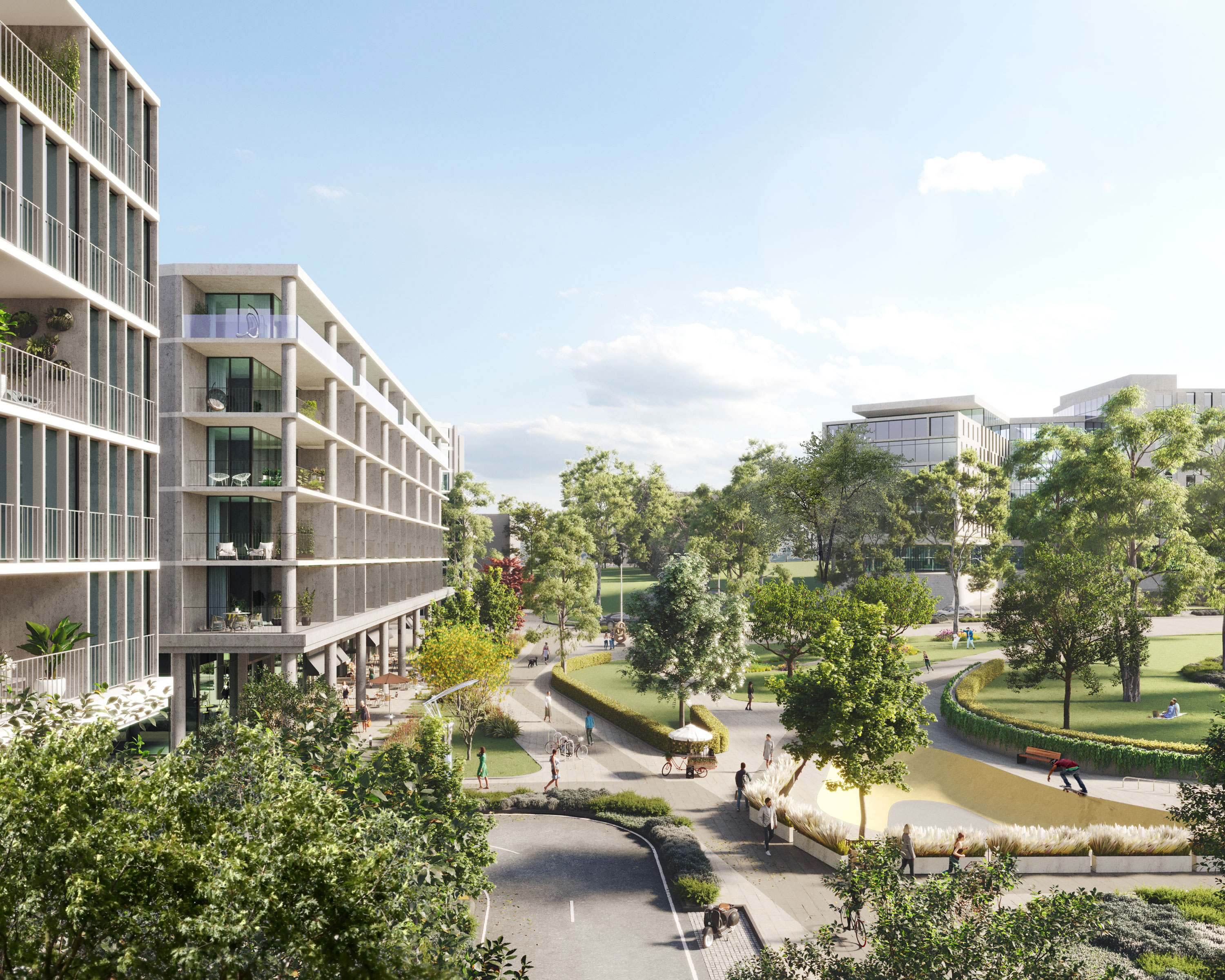 The development is targeting 7-8 star buildings, solar passive design, rainwater harvesting, EV charging stations and extensive tree retention and planting progams combining to mitigate urban heat island effects.