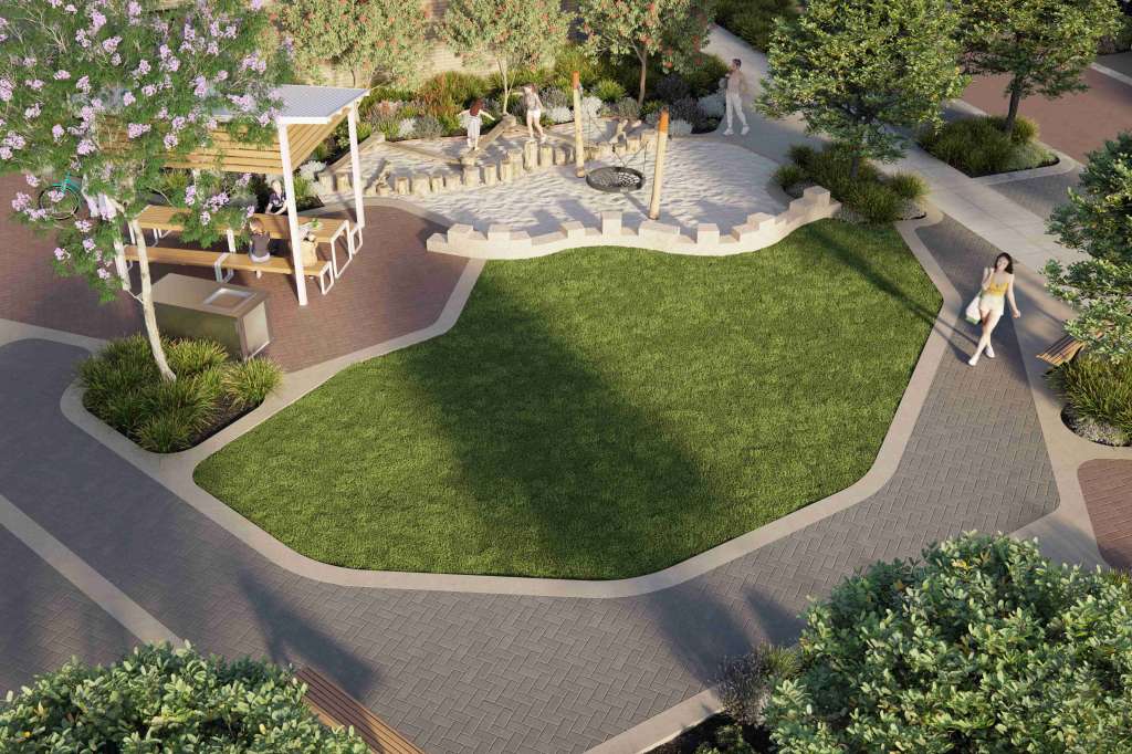 Designed with soft lighting and native plants that are endemic to the wetlands which aims to bring the park into the community. The walkway will share elements of the other two communal spaces via colour scheme, paving and artwork but is intended to be more natural in character.
