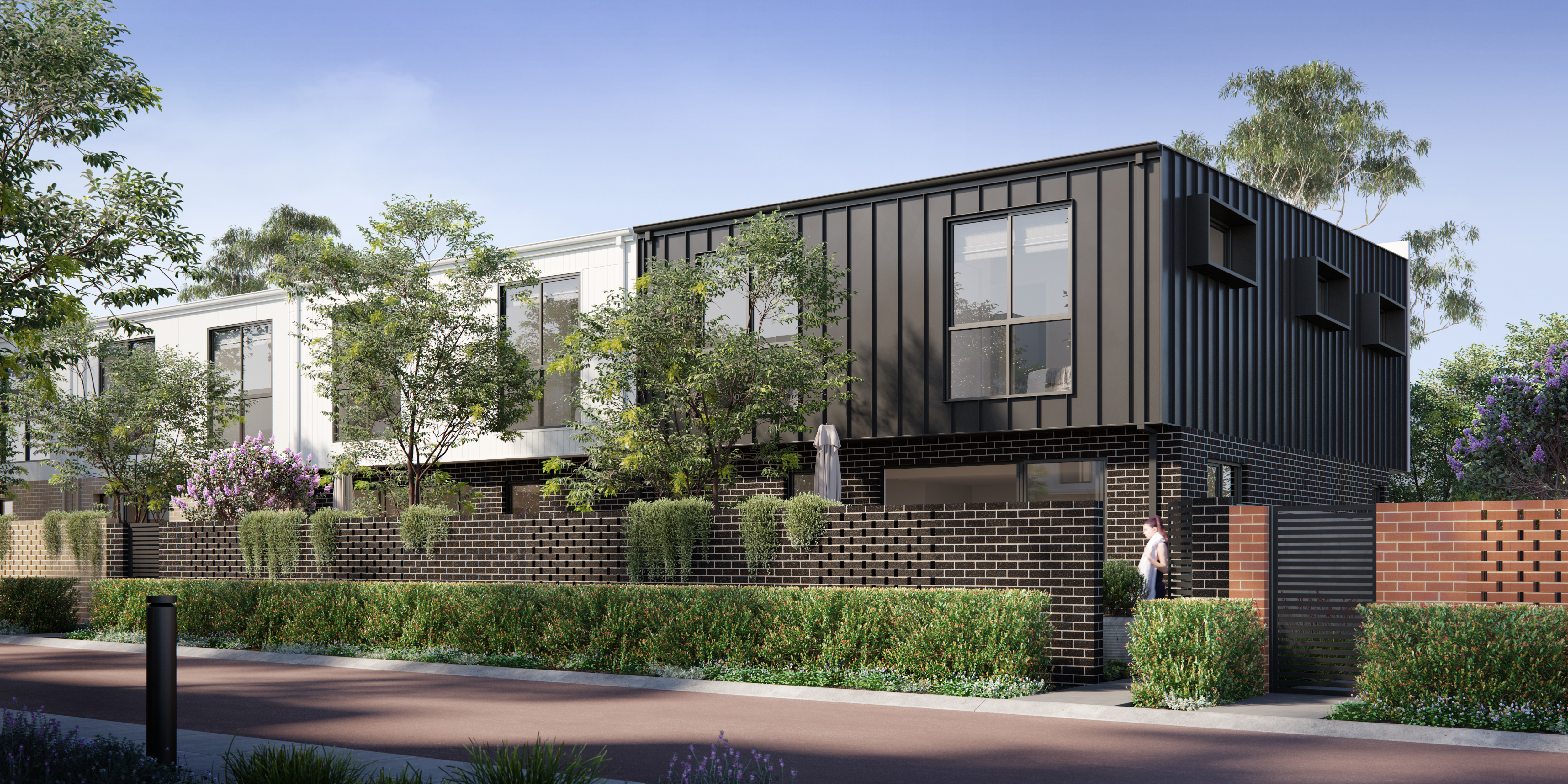 The entry from Harborne Street includes an area of landscaped space. Quite formal in its design as it is the main pedestrian and car entry. Accompanied by low walls, fruiting trees, hedging plants and edible species. These market garden inspired species are purposely set at the eastern end furthest away from the natural lake system to the west. The existing Cape Lilac tree is uplit at night for a beautiful and natural entry feature.