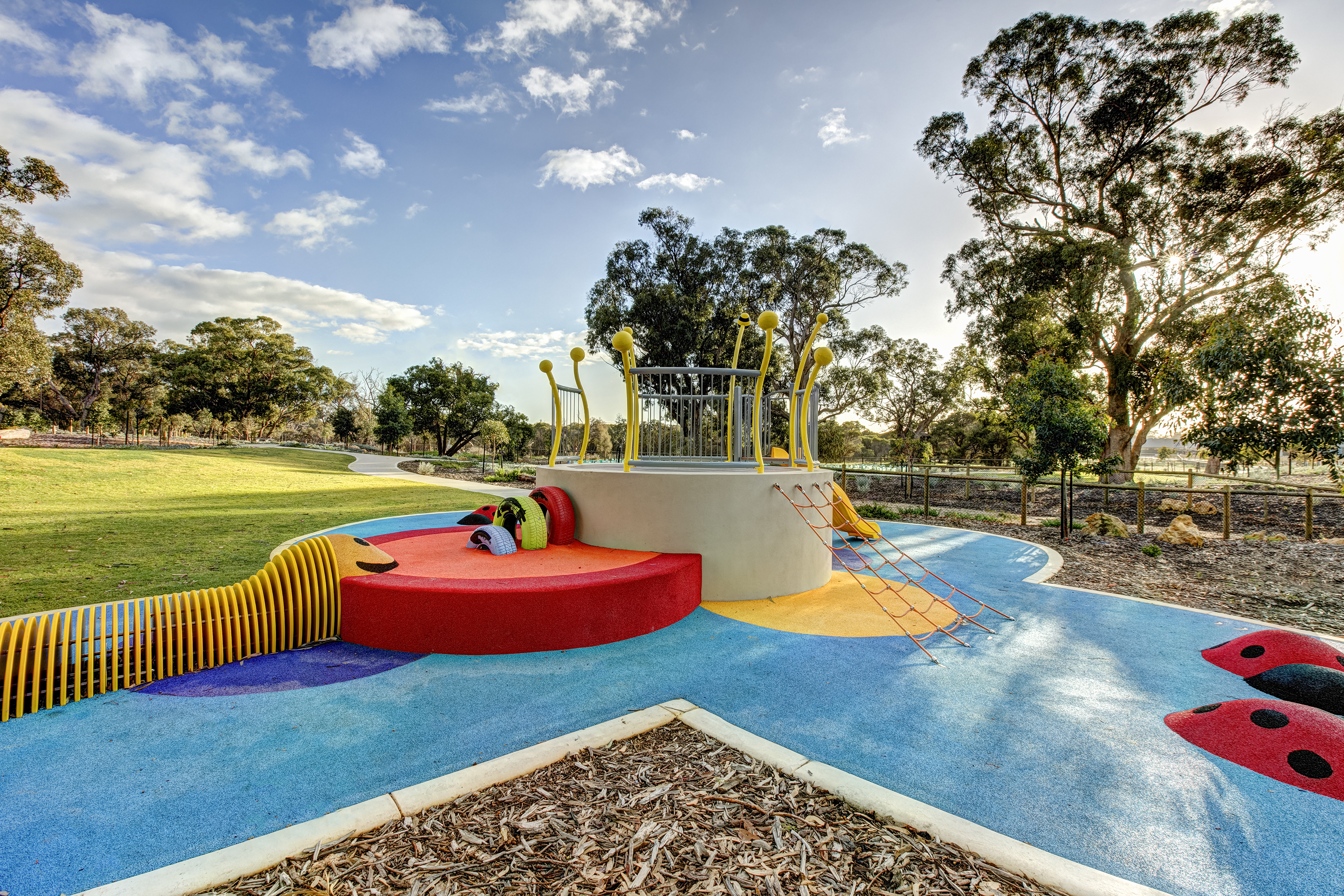 Enjoy a fun filled family outing at Ladybug Park, featuring a nature-inspired playground with caterpillar designed play equipment. Find the 1ha park nestled in between Paganoni Lake and Lake Valley Drive, where a fauna crossing is located. Relax under the Jarrah trees for a family picnic, and watch the kids play for hours on the playground equipment.