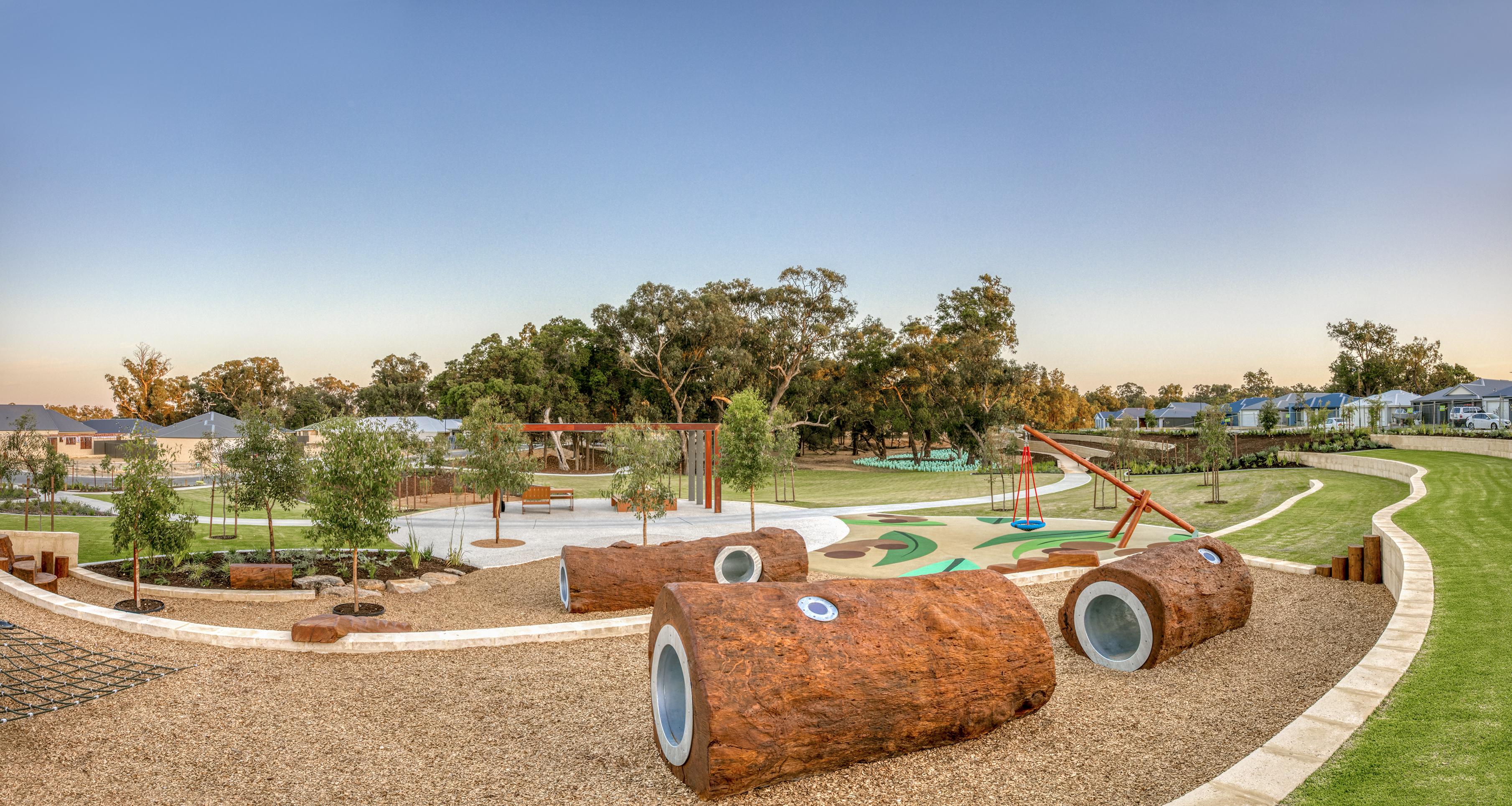 This stunning public open space on Dragonfly Boulevard includes significant turf area, a footpath network, shade structure, picnic tables, landscaped garden beds and retained vegetation as well as fun things for the kids, such as a pendulum swing, play net and log tunnels.