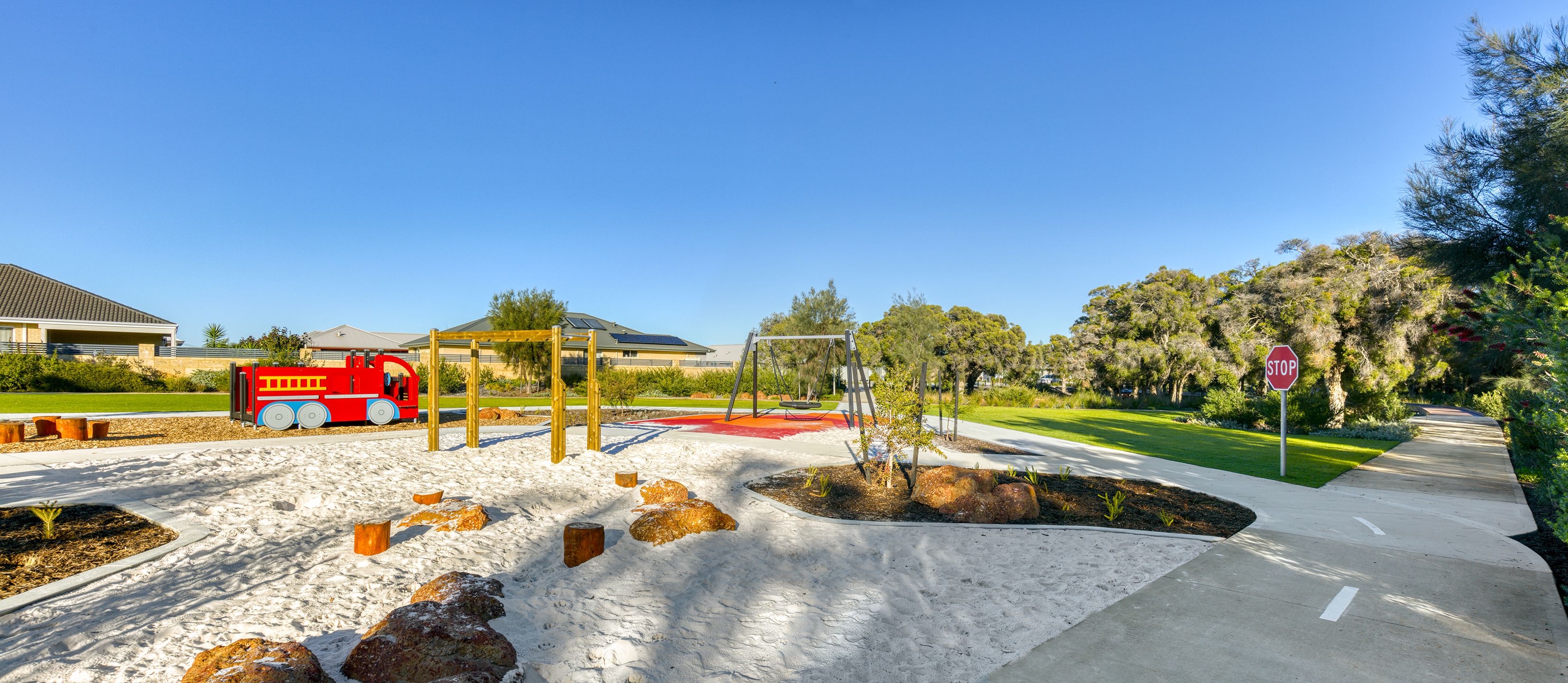 Fire Station Park continues the transport theme and is complete with swings, monkey bars, nature play logs and a bright red fire truck! The bike paths feature road rules and connect with the feature Traffic Park at the centre of the estate.
